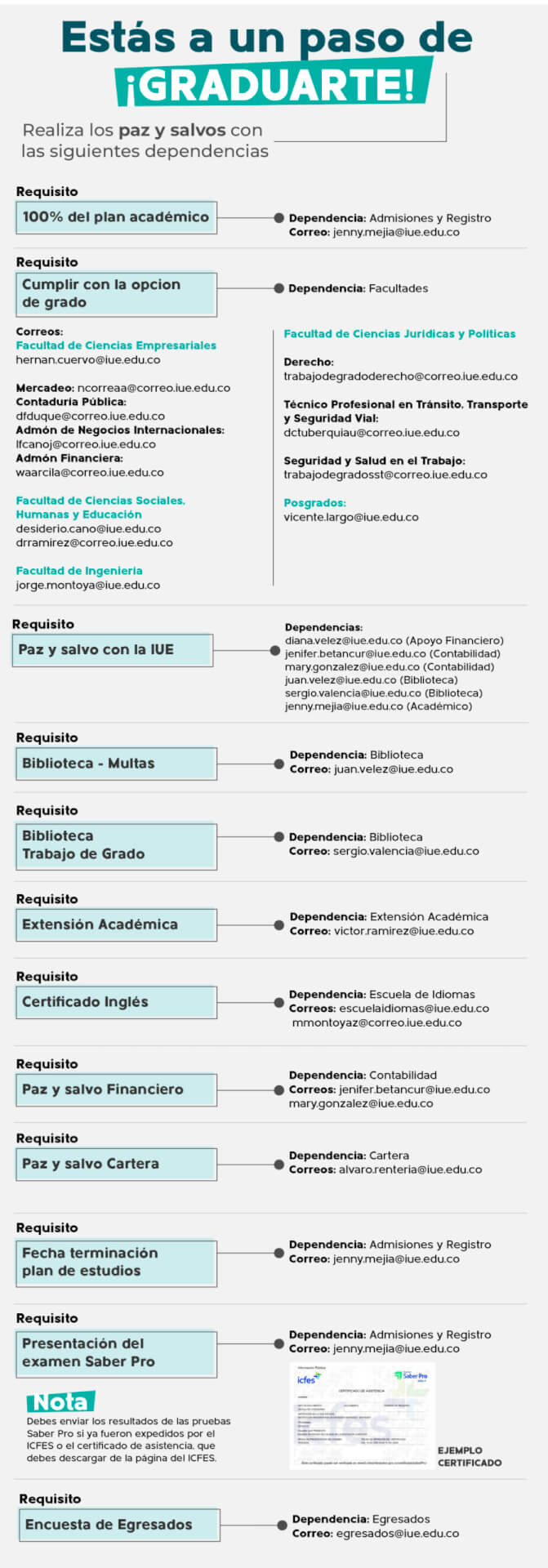 - Egresados de pregrado con distinción Cum Lauden o mejor promedio en Saber PRO:100%. Aplica para el primer semestre de la oferta que elija en la IUE (pregrado o posgrado) o exoneración de los derechos de grado.
